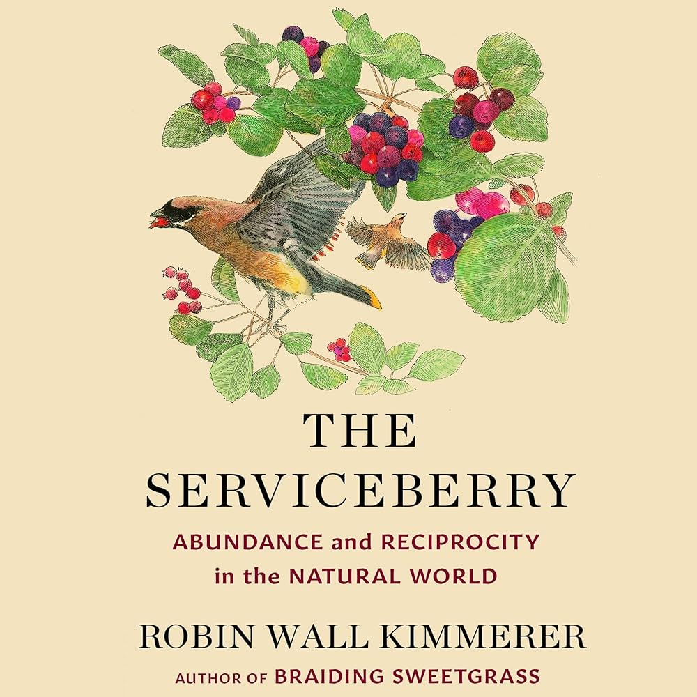 I have read all of Robin Wall Kimmerer’s books. She is a generous scholar, sharing her knowledge of Potawatami culture, beliefs, and practices and combining that with her background in biology. Her most recent book, The Serviceberry: Abundance and Reciprocity in the Natural World, is short at just over one hundred pages, and just like a serviceberry, this book is packed with nutrients for the mind and body.
